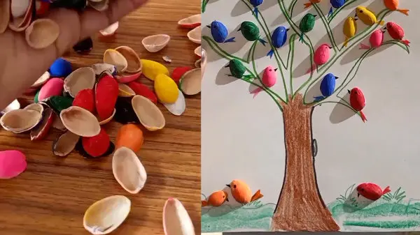 به گزارش رکنا، این کاردستی با پوست پسته ساخته شده است. کافی است روی کاغذ درختی را نقاشی و آن را با ماژیک رنگ آمیزی کنید. با استفاده از پوست پسته های زیاد و رنگ کردن آنها با هر وسیله دلخواه و سپس قرار دادن آنها در بخش های مختلف شاخه درخت نقاشی کرده می توانید حالت گنجشک را روی درخت ایجاد کنید. با استفاده از ماژیک برای این گنجشک های رنگی منقار و چشم بگذارید.