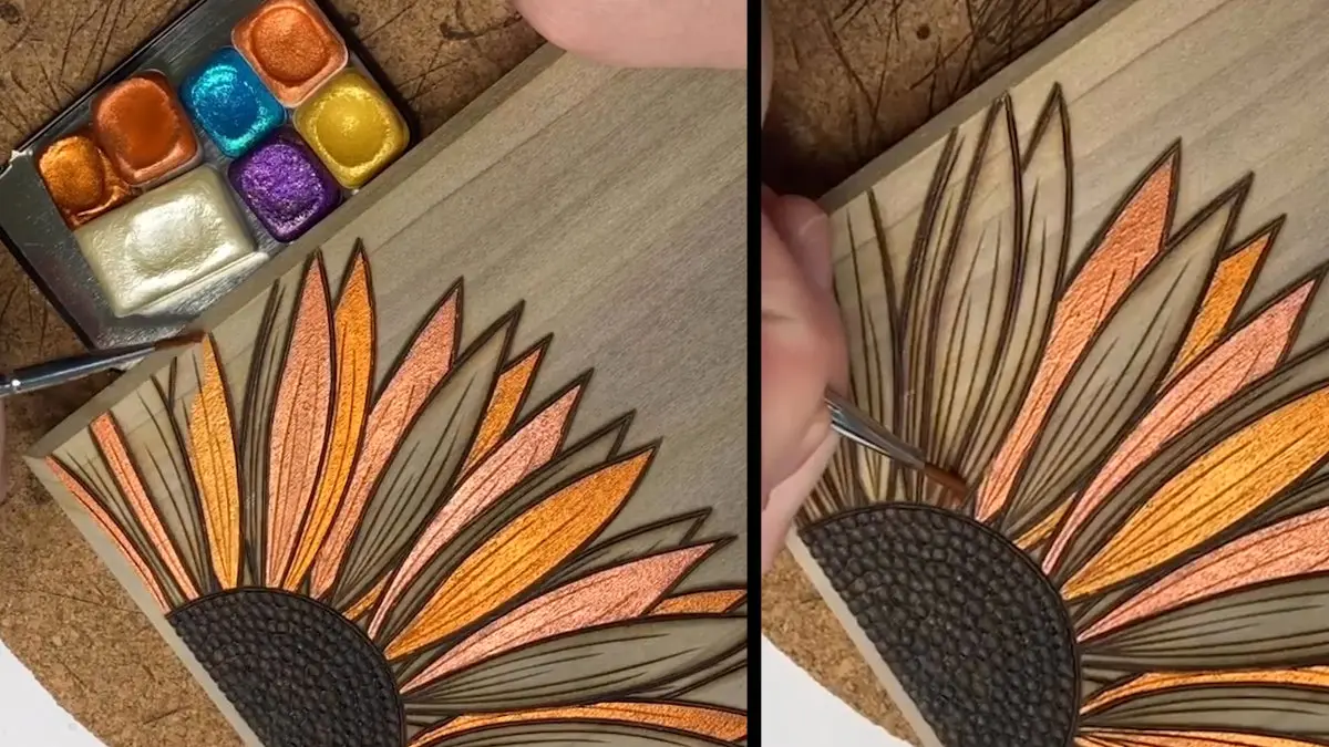 به گزارش رکنا، نقاشی کشیدن روی چوب از زیبایی های خاصی برخوردار است. در این فیلم مشاهده می شود که روی تکه ای چوب با برش دادن آن طرح گل آفتابگردون کشیده شده و با ابزار رنگی مانند آبرنگ یا رنگ روغن رنگ آمیزی شده است.