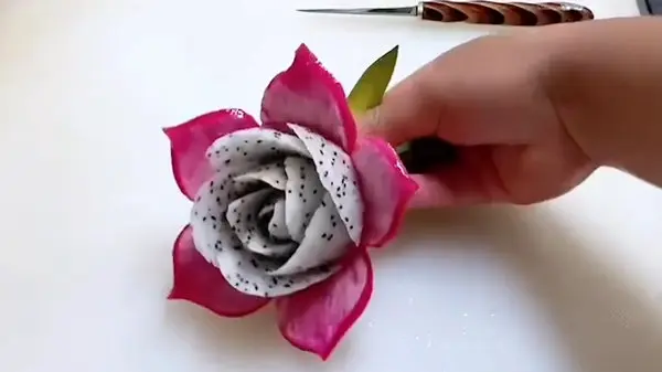 به گزارش رکنا، اگر به تزئین میوه ها علاقه دارید امروز می توانید این آموزش را فرا بگیرید و مطابق فیلم با میوه اژدها یک گل زیبا درست کنید. کافی است بخش هایی از سطح پوست و گوشت میوه اژدها را برش های دالبری و منطم بزنید تا شکل گل را به خود بگیرد.