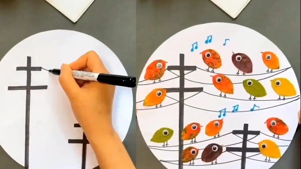 به گزارش رکنا، ساخت گنجشک با برگ های رنگارنگ به ویژه در فصل پاییز که تنوع رنگ برگ ها زیاد است کاردستی امروز است. کافی است روی کاغذ سفید با ماژیک خطوط تیر چراغ برق را ترسیم کنید و سپس روی هر خط ترسیمی تعدادی برگ را در رنگ های مختلف قرار دهید. برچسب چشم را روی هر برگ بچسبانید تا شکل گنجشک شما تکمیل شود. برای ترسیم پاهای گنجشک هم از ماژیک کمک بگیرید.