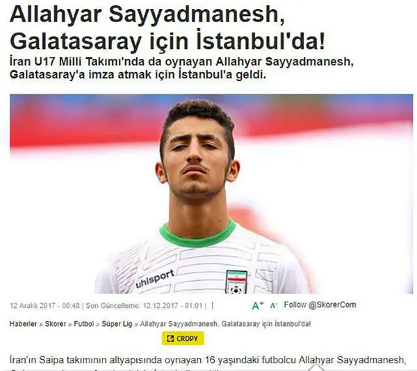 رکنا: صیادمنش، بازیکن تیم ملى نوجوانان و باشگاه سایپا، دیشب با حضور در استانبول با مدیران گالاتاساراى ترکیه، به توافق رسید.