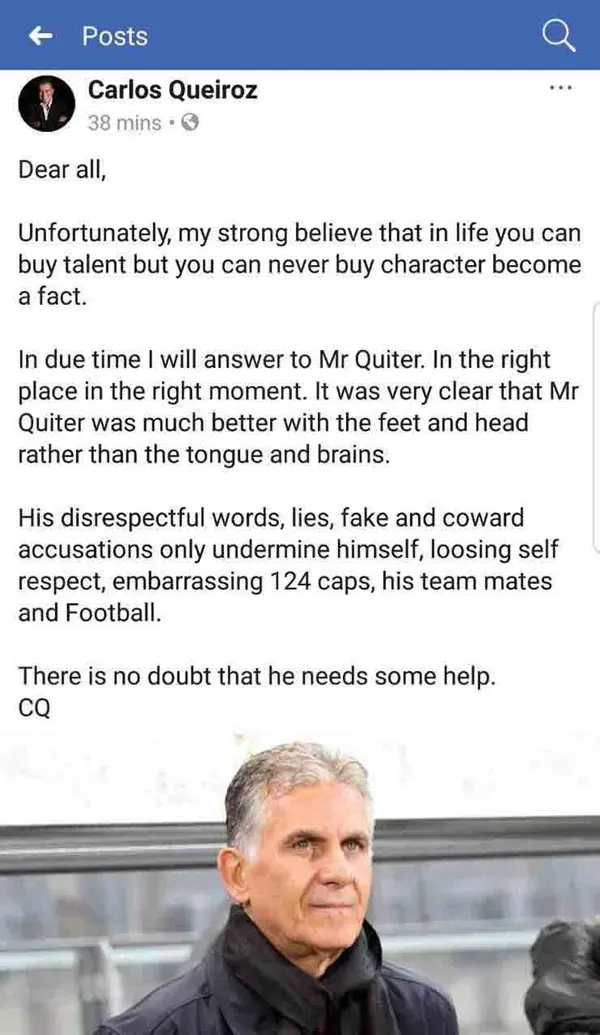 صحبت های غیرمحترمانه، دروغ، ساختگی و اتهام های بزدلانه او تنها بی احترامی به 124 بازی ملی، هم تیمی های او و فوتبال بود.