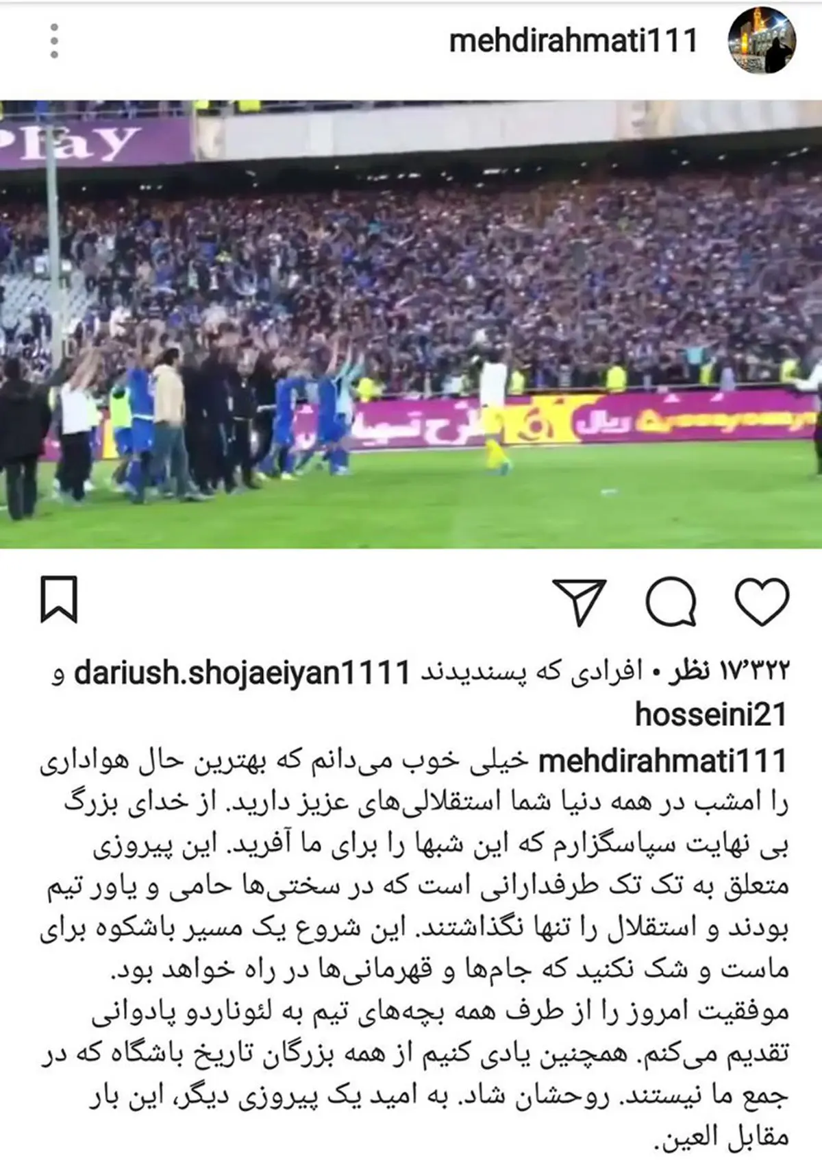 سیدمهدی رحمتی دروازه بان استقلال Esteghlal بعد از برد روز گذشته این تیم مقابل پرسپولیس مطلبی را در صفحه شخصی خود منتشر کرد.