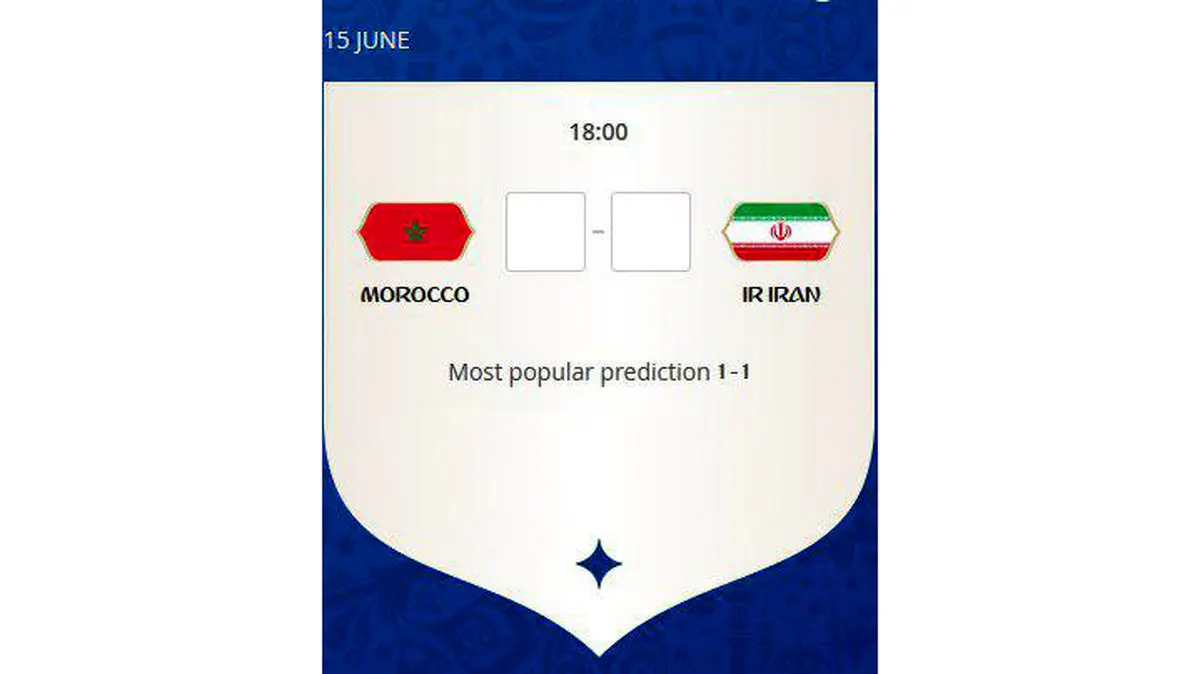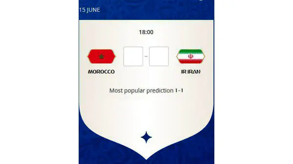 وقتی در سایت فیفا برای پیش بینی بازی های ایران مراجعه کنید، قابل مشاهده است که پیش بینی اکثر کاربران در خصوص بازی ایران و مراکش، تساوی یک –یک است. همچنین در خصوص بازی های ایران و اسپانیا و ایران – پرتغال، به ترتیب باخت 3 بر صفر و 2 بر صفر ایران، پرتکرار ترین نتیجه ای است که از سوی کاربران پیش بینی شده است.