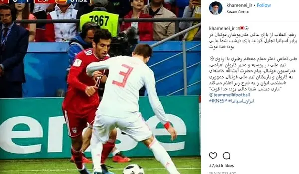 صفحه رسمی اینستاگرام Instagram منتسب به حضرت آیتالله خامنهای رهبر معظم انقلاب اسلامی با انتشار تصویری از لحظه لایی زدن وحید امیری به پیکه مدافع صاحبنام اسپانیا از بازی عالی ملیپوشان تجلیل کرد. دفتر مقام معظم رهبری در تماس با اردوی تیم ملی در روسیه و مدیر کاروان اعزامی، پیام ایشان را به کاروان و بازیکنان تیم ملی فوتبال جمهوری اسلامی ایران به شرح ذیل اعلام کرد: