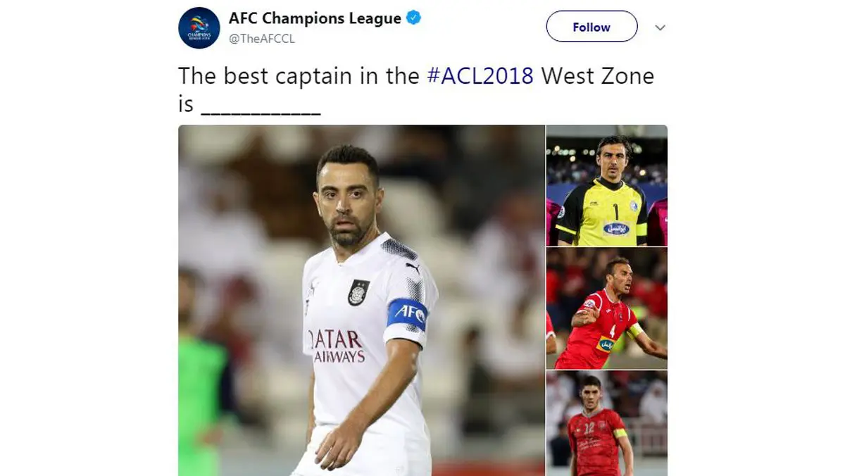 صفحه رسمی مسابقات جام باشگاه های آسیا در توئیتر تصاویر کاپیتان های 4 تیم استقلال، السد، الریان و پرسپولیس را به عنوان تیم های منتخب غرب آسیا منتشر کرد.