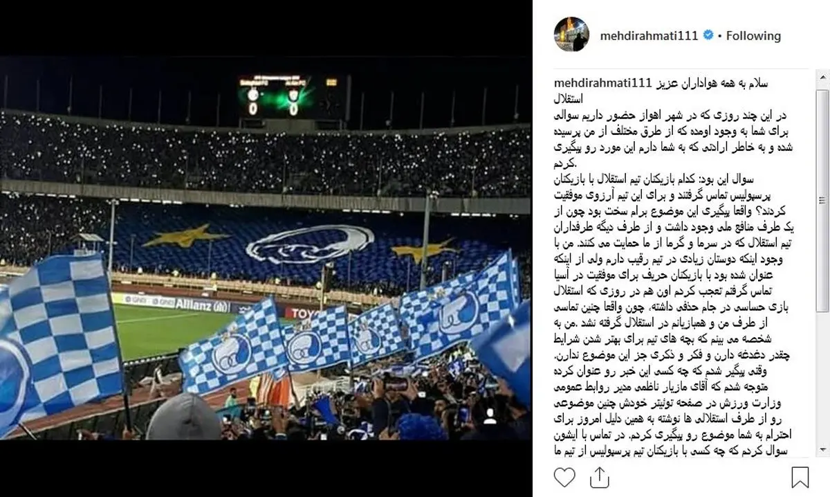 مهدی رحمتی، کاپیتان استقلال Esteghlal در اینستاگرام Instagram خود به انتقاد هواداران از بازیکنان به علت تماس با تیم رقیب و آرزوی موفقیت برای پرسپولیسی ها نوشت: