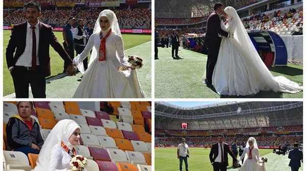 زوج هوادار خوش ذوق تیم مالاتیا اسپور ترکیه، پیش از شروع دیدار امروز این تیم، در استادیوم خانگی مالاتیا مراسم عقد و ازدواج خود را برگزار کردند.