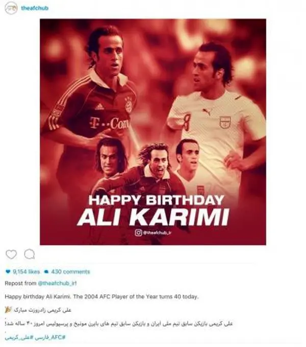 رکنا: صفحه اینستاگرام کنفدراسیون فوتبال آسیا تولد علی کریمی را تبریک گفت.