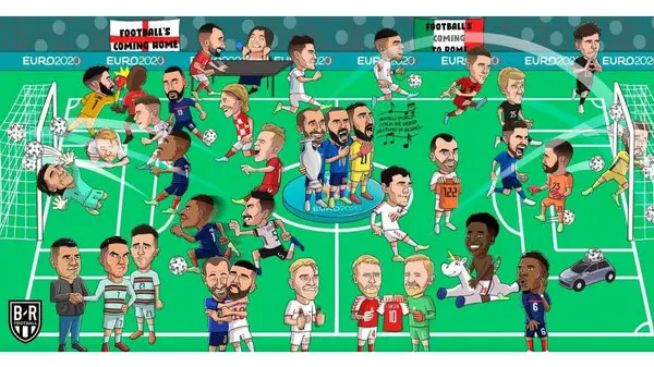 در این تصویر خلاصهای از اتفاقات جالب رقابتهای یورو ۲۰۲۰ به تصویر کشیده شده است. اما در گوشه سمت چپ تصویری از علی دایی، گلزن بزرگ و مشهور فوتبال ایران دیده میشود که در حال دست دادن با کریستیانو رونالدو است. ستاره پرتغالی اگرچه وداعی زودهنگام با تورنمنت داشت، اما از نظر فردی درخشان ظاهر شده و علاوه بر کسب عنوان آقای گلی، به رکورد ۱۰۹ گل علیی دایی نیز رسید و در کنار او به بهترین گلزن تاریخ رده ملی بدل شد.