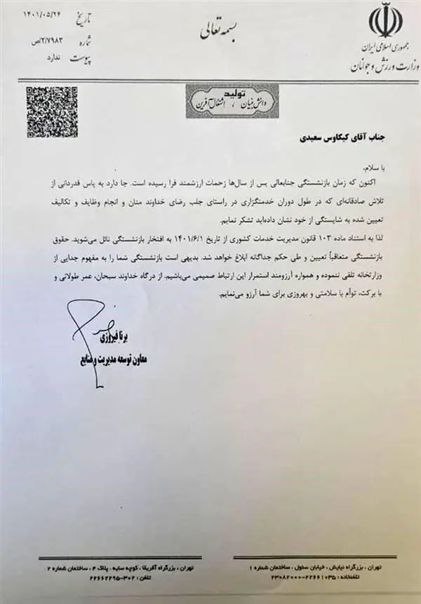 این در حالی است که حکم بازنشستگی کیکاوس سعیدی در تاریخ 26 مردادماه از سوی معاون توسعه مدیریت و منابع وزارت ورزش و جوانان صادر شده است و تاکید شده است که سرپرست دبیر کلی کمیته ملی المپیک از تاریخ یک شهریورماه 1401 بازنشسته است.