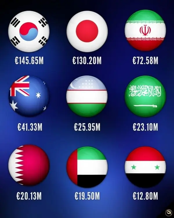 دیگر تیمهای حاضر استرالیا 41.33 میلیون یورو، ازبکستان 25.95 میلیون یورو، عربستان 23.10 میلیون یورو، قطر 20.13 میلیون یورو، امارات 19.50 میلیون یورو و در آخر هم تیم ملی سوریه با 12.80 میلیون یورو در جایگاه نهم قرار دارد.