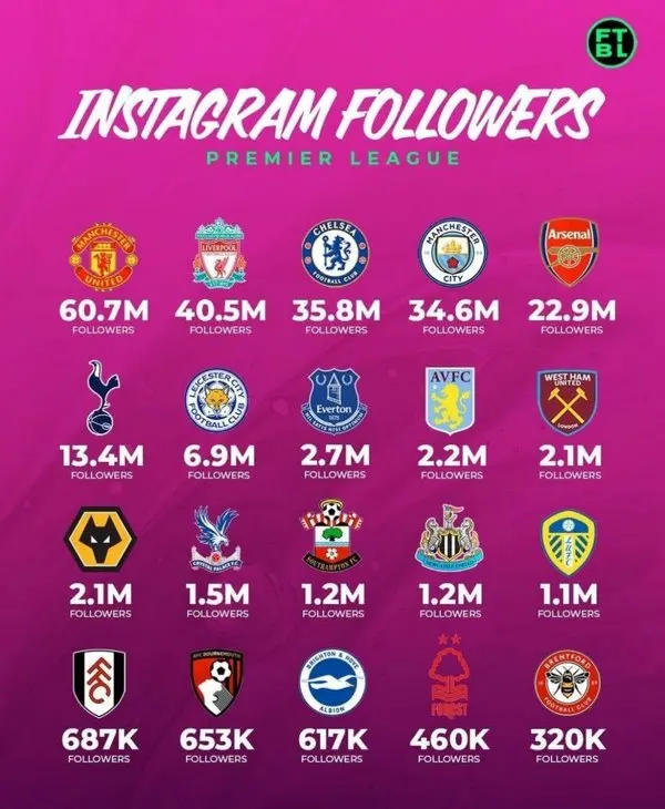 بعد از تاتنهام، دیگر تیم های حاضر در لیگ برتر انگلیس زیر 10 میلیون دنبال کننده دارند.