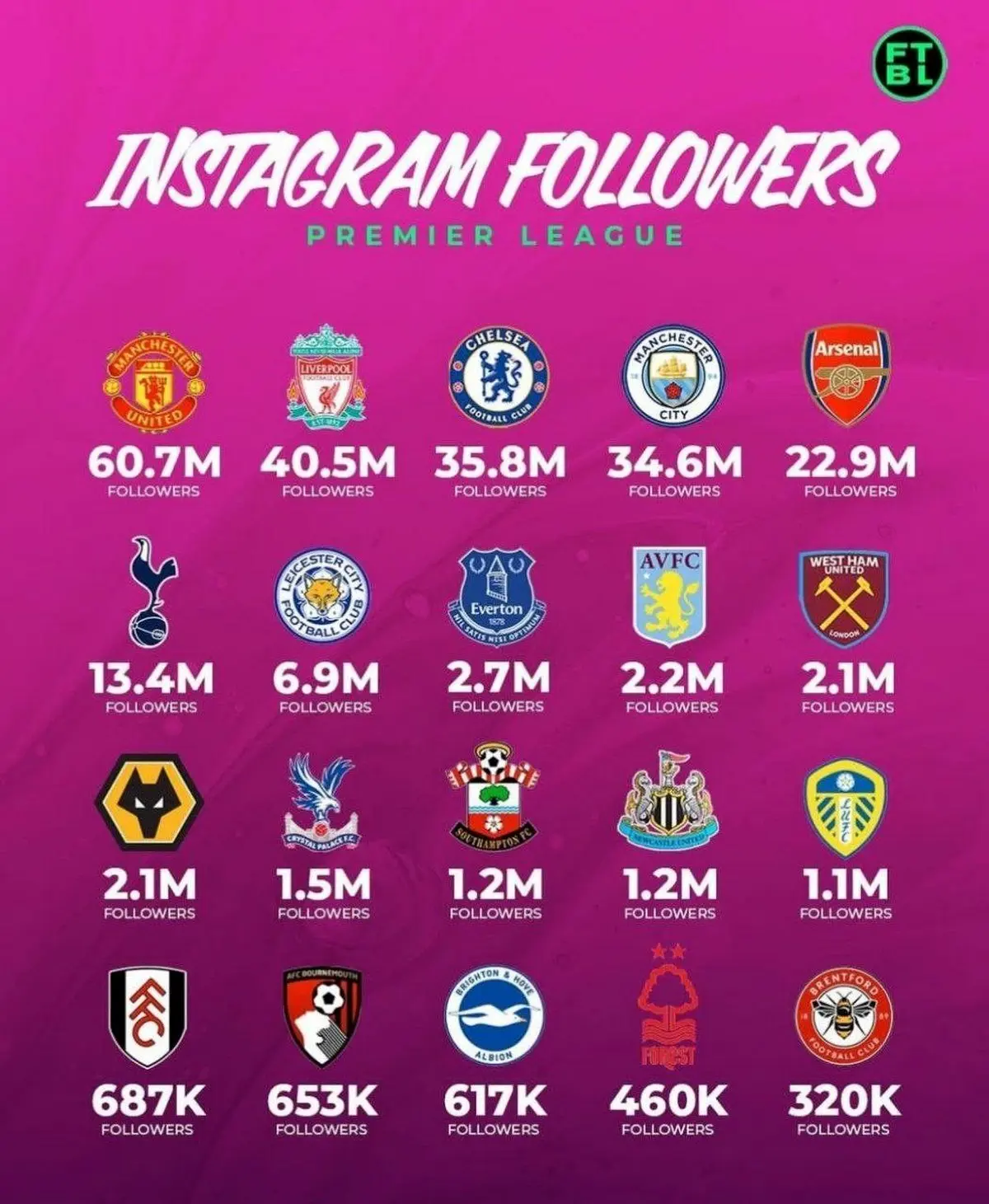 در جایگاه دوم با بیش از 20 میلیون ختلاف لیورپول با 40.5 میلیون دنبال کننده حضور دارد. چلسی با 35.8، منچسترسیتی با 34.6 و آرسنال با 22.9 میلیون دنبال کننده 5 تیم اول انگلیسی هستند.