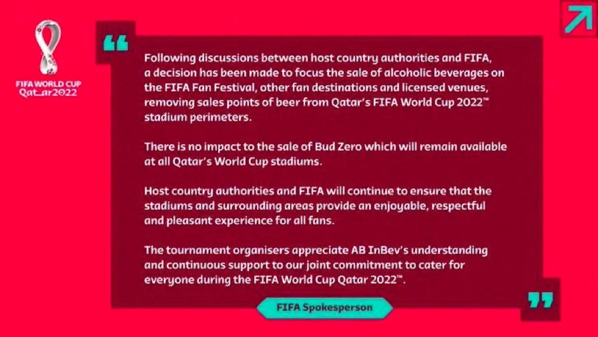 به گزارش کنا، با اعلام رسمی فیفا فروش مشروبات الکلی در ورزشگاههای میزبان جام جهانی 2022 ممنوع خواهد بود. این خبر قطعا برای هواداران فوتبال ناخوش آیند خواهد بود.