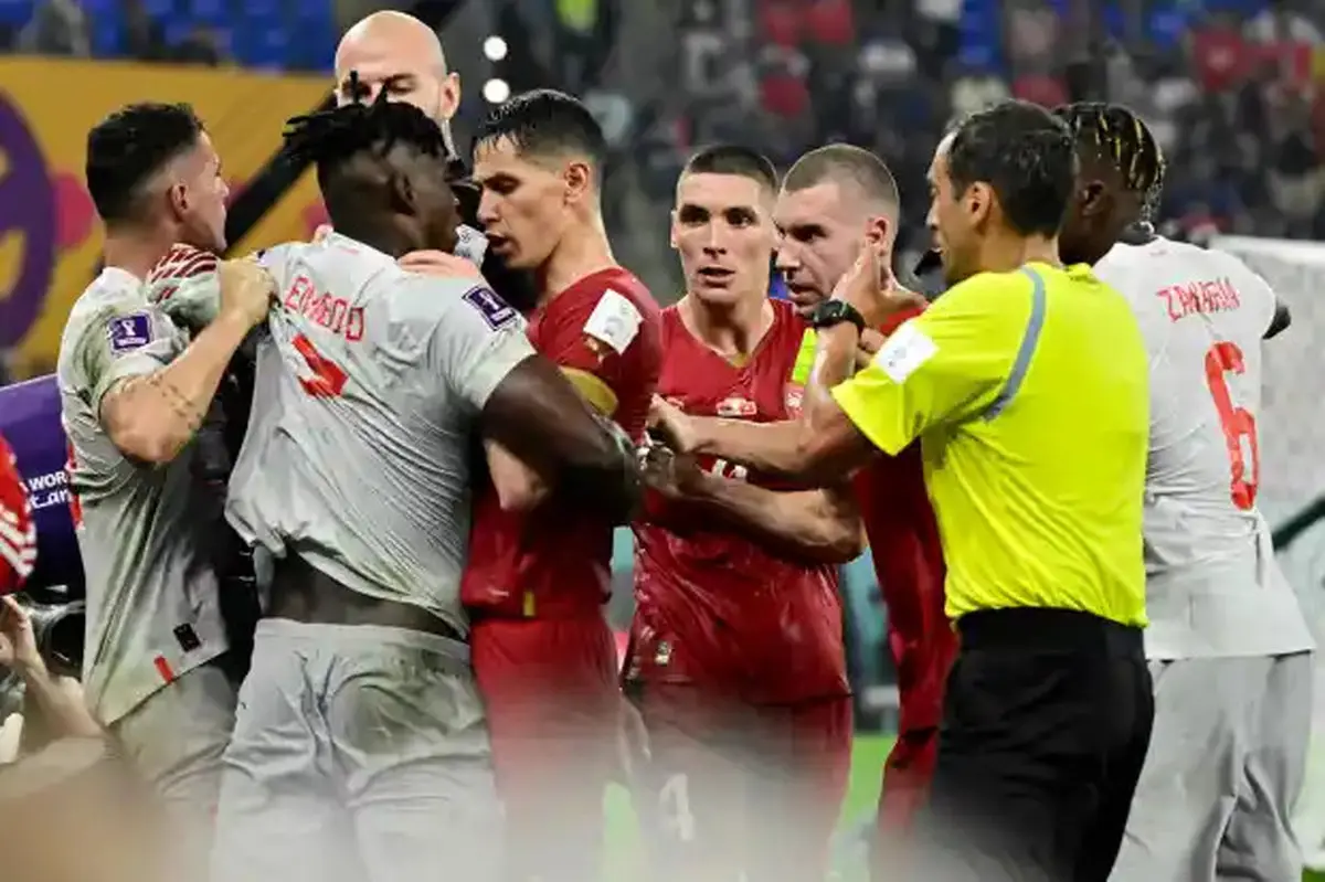 در جریان این بازی اتفاقات و حواشی زیادی رخ داد. در یک صحنه ستاره سوئیس گرانیت ژاکا رو به نیمکت صربستان حرفهایی زد و حرکتی انجام داد که موجب خشم آنها شد. در نهایت درگیری میان دو طرف صورت گرفت.