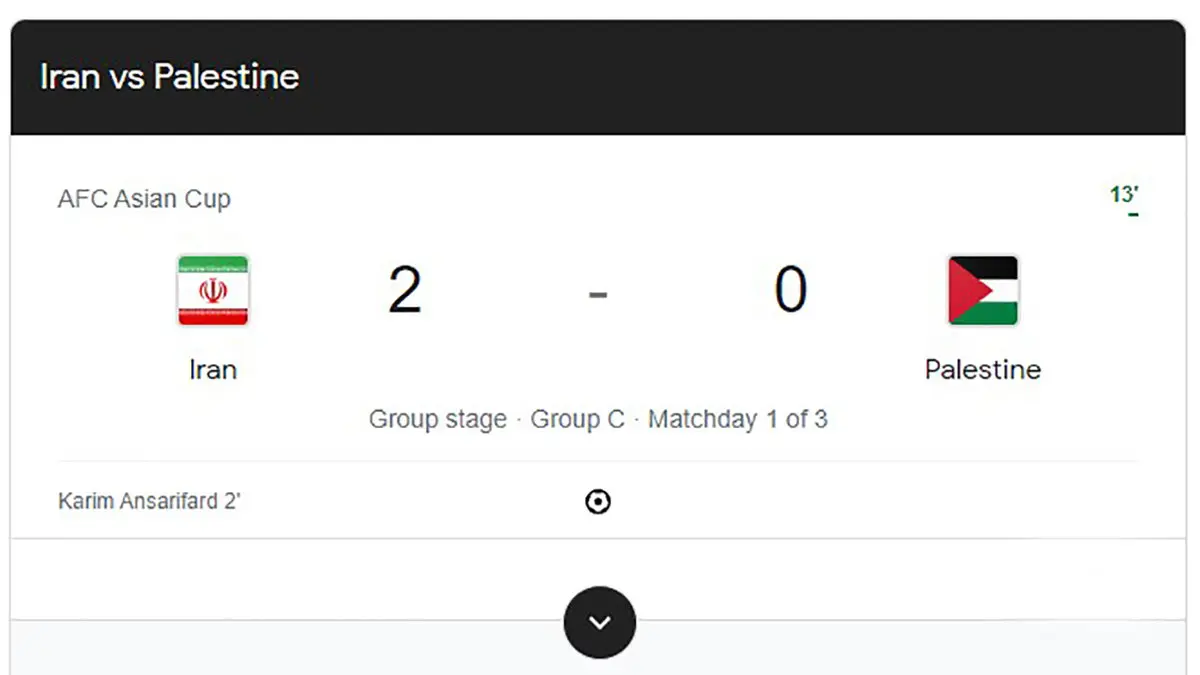 همچنین گل اول ایران به فلسطین در دقیقه 2 توسط کریم انصاری فرد به ثمر رسید.
