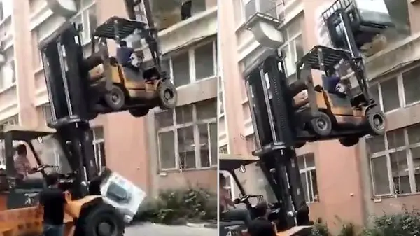 سقوط وحشتناک ماشین لباسشویی از لیفتراک!+فیلم