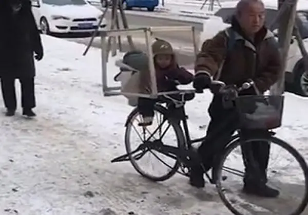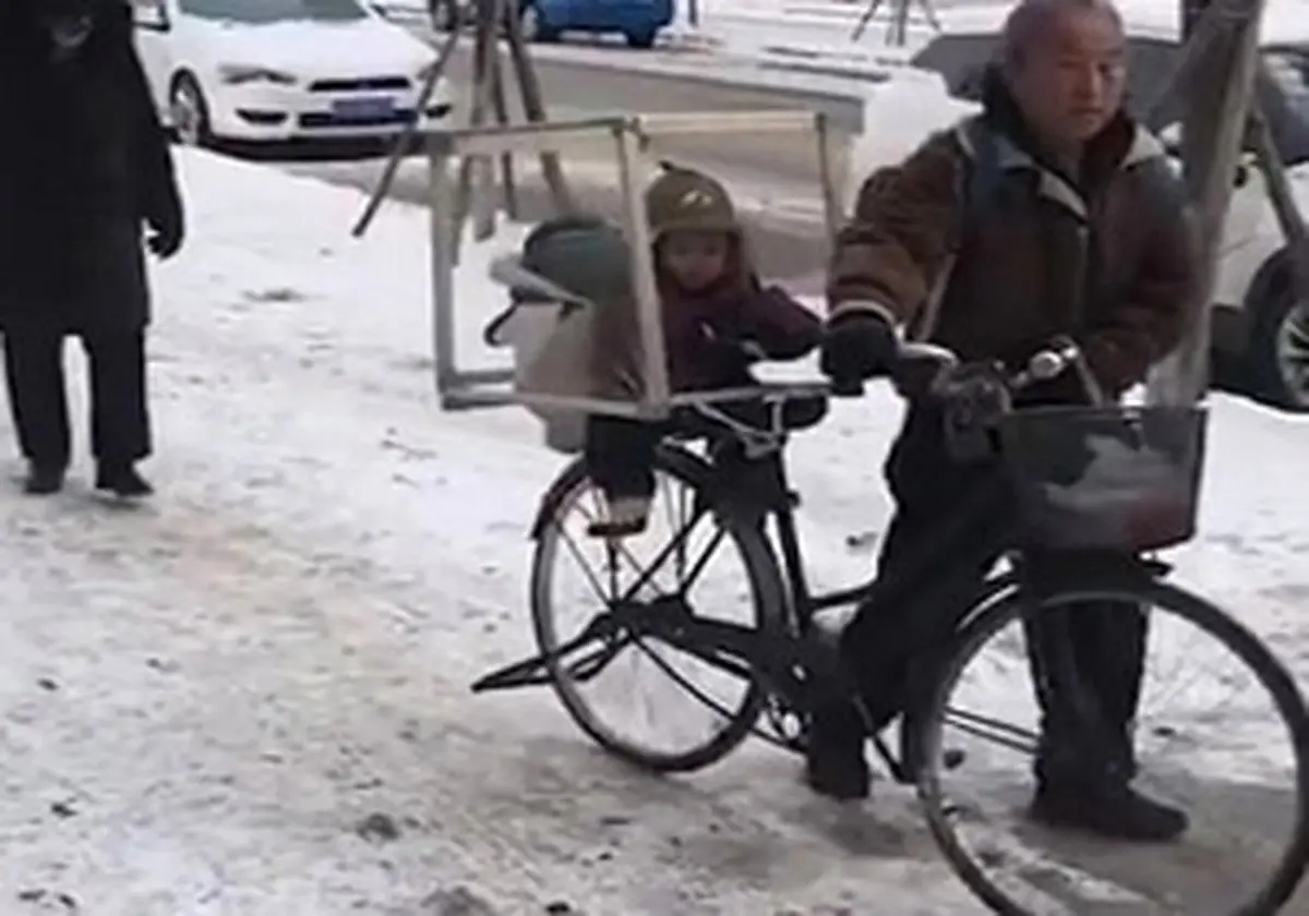 از قرار معلوم پیرمرد مسن که همچنان شاغل بوده برای نگه داری از نوه اش که با خود نیز به محل کار می برد و از بارش برف و باران و خطر سقوط از روی دوچرخه در امان باشد تصمیم گرفت تا با ساخت یک محفظه شفاف و شیشه ای او را محافظت کند.