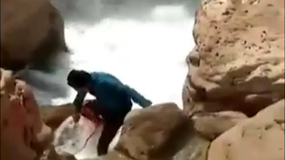 تعداد زیادی ماهی که به دلیل وجود فشار آب و سنگهای بزرگ در گوشهای از رودخانه گیر افتاده بودند توسط یک مرد با توری کوچک صید شدند.