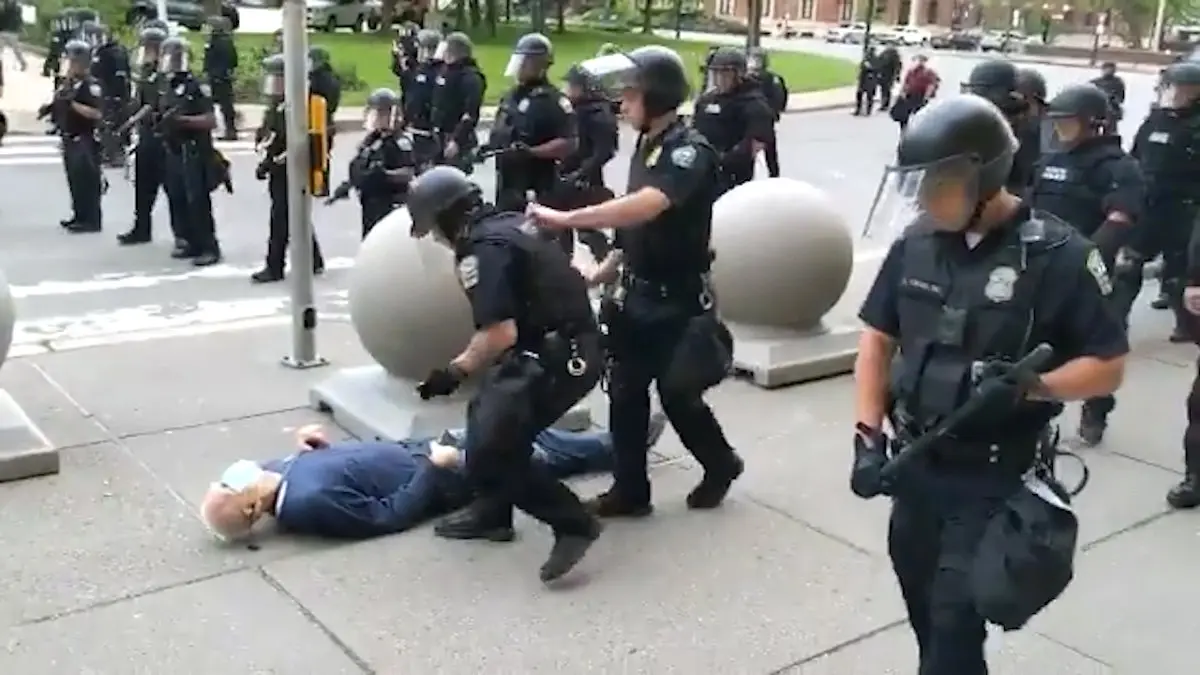 دوربین گزارشگر شبکه رادیویی «WBFO» تصاویری را از اعتراضات روز گذشته در شهر «بافلو» در ایالت نیویورک ضبط کرده که نشان میدهد دو افسر پلیس با خشونت یک پیرمرد 75 ساله را هل میدهند.