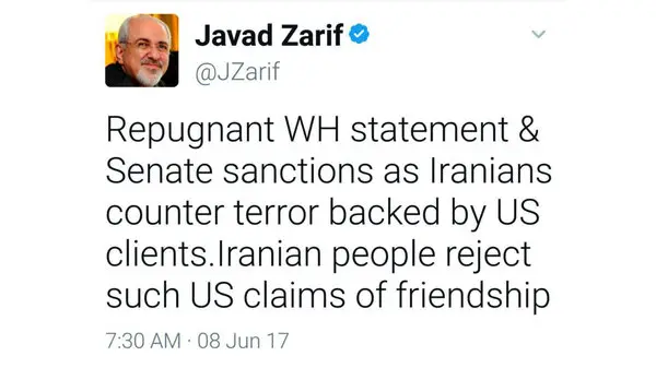 رکنا: محمدجواد ظریف صبح روز پنچشنبه در توییتی به بیانیه کاخ سفید در ارتباط با حوادث تروریستی روز گذشته در تهران و تصویب فوریت اعمال تحریمهای جدید علیه ایران در سنای این کشور واکنش نشان داد.