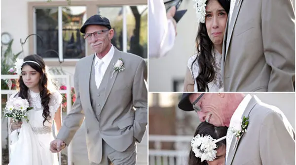جیم مردی مبتلا به سرطان است که تمام این آرزوها را برای دخترش دارد در حالیکه دختر وی 11 ساله است. پزشکان به این مرد اعلام کردهاند به دلیل بیماری سختی که دارد زیاد زنده نمیماند؛ به همین علت برای دخترش یک عروسی نمادین گرفت تا آرزوی قلبیش که همراهی دخترش در جشن عروسی بود، برآورده کند و همراه با دخترش در این جشن نمادین اشک ریخت.برای ورود به کانال تلگرام ما کلیک کنید.