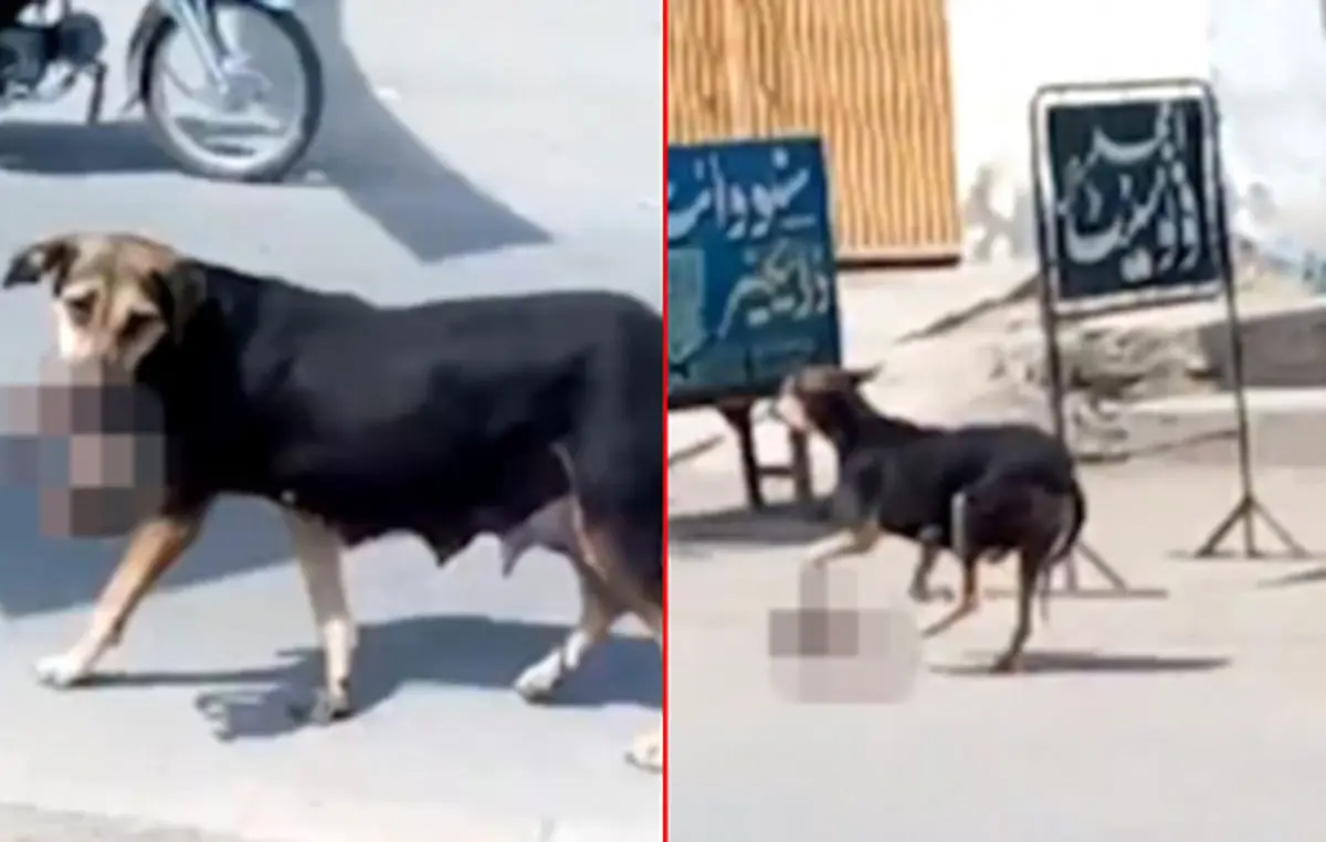 رکنا: تصاویری از یک سگ در فضای مجازی منتشر شد که نشان می دهد این حیوان درحالیکه نوزاد مرده ای به دهان گرفته در حال راه رفتن است.