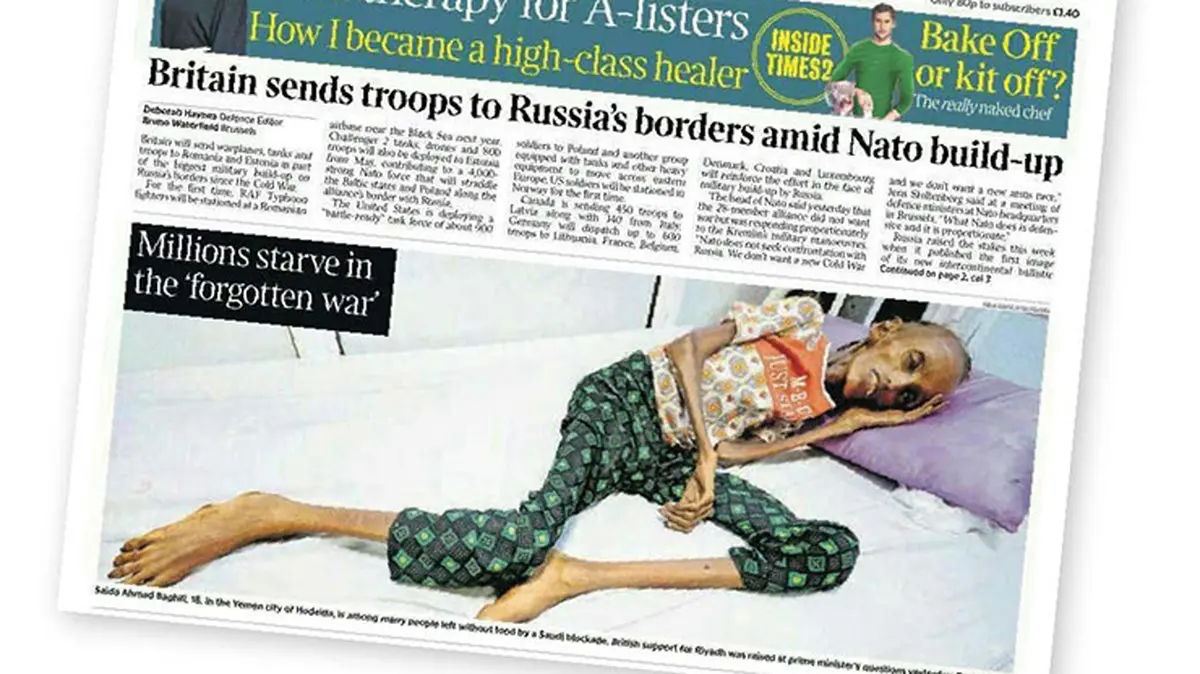در صفحه اول این روزنامه تصویر دختر 18 ساله یمنی به چشم میخورد که به دلیل سوء تغذیه به شکل اسکلتی زنده در آمده و در نتیجه کمبود مواد غذایی در یمن به شکل ناراحت کنندهای لاغر شده است.روزنامه تایمز نوشته در حالی میلیونها یمنی از سوء تغذیه و گرسنگی رنج میبرند که عربستان کشورشان را با بمبهایش چندپاره میکند.در این گزارش «سعیده احمد» دختر 18 سالهای که به شدت دچار سوء تغذیه شده و وزن او از وزن یک کودک بیشتر نیست به کشورش یمن تشبیه شده که در پی جنگ عربستان علیه یمن به این شکل درآمده است.این روزنامه گزارش داده که سعیده به دلیل سوء تغذیه در بیمارستان شهر بندری حدیده بستری شده در حالی که این شهر تحت محاصره اقتصادی عربستان است و جهان آنها را فراموش کرده است. صندوق کودکان سازمان ملل متحد (یونیسف) نیز در بیانیهای اعلام کرد جنگ 18 ماهه عربستان در یمن، 370 هزار کودک را در معرض خطر سوءتغذیه شدید قرار دادهاست ونیمی از یمنیها درگرسنگی به سر میبرند. یونیسف همچنین اعلام کرد که بیش از 10 هزار کودک یمنی به علت نبود کمکهای پزشکی جان خود را از دست دادهاند.