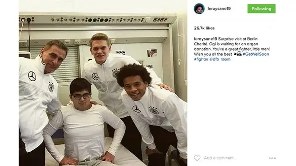 لروی سانه، مهاجم ملی پوش تیم منچسترسیتی، در اینستاگرام خود عکسی منتشر کرده که عیادت او و ماتیاس گینتر را از یک بیمار نیازمند به اهدای عضو در موسسه خیریه برلین به نمایش کشید. اوگی نام این بیمار است که از دیدن سانه و گینتر روحیه گرفته و به مبارزه با بیماری ادامه می دهد.برای ورود به کانال تلگرام ما کلیک کنید.