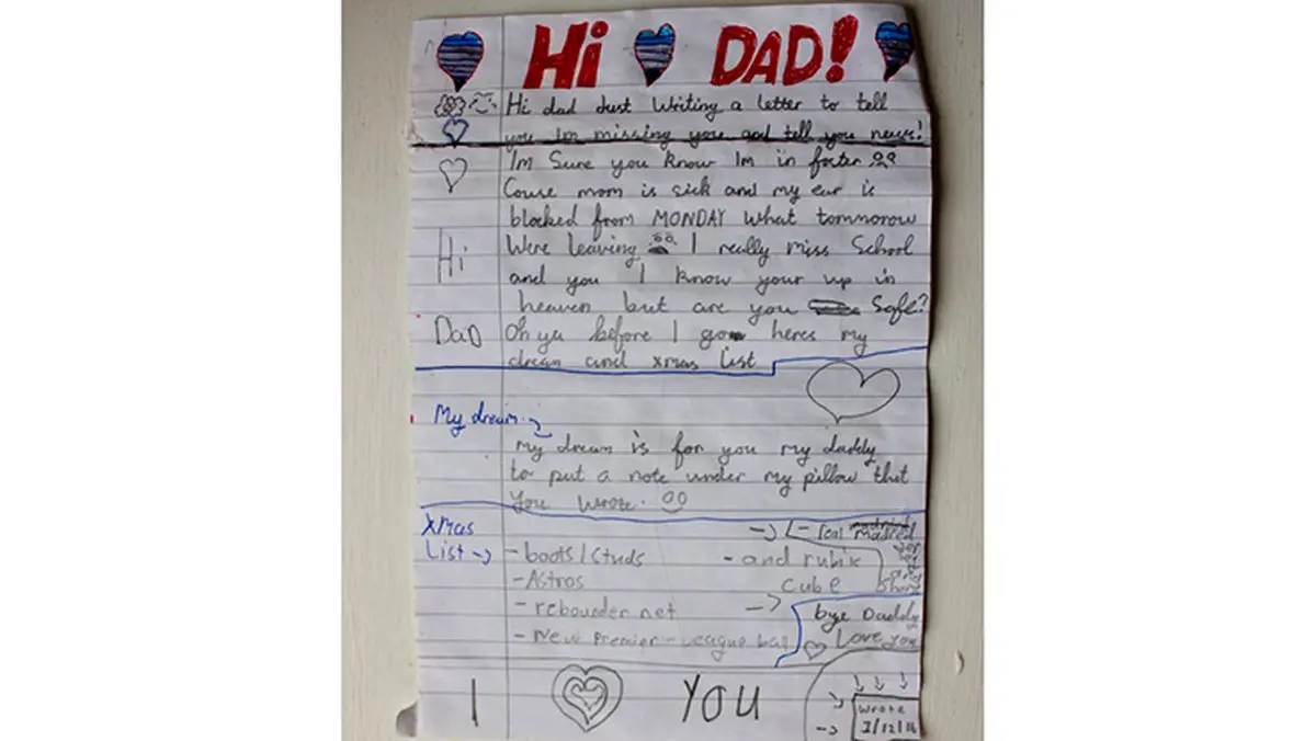 متن نامه سرشار از احساسات یک کودک به پدر خود بود که با نقاشی هایی کودکانه مزین شده بود. پسرک در نامه نوشته بود که مطمئنا پدرش در میان آسمان و در جای خوبی سر می کند همچنین از حال مادر بیمار خود خبر داده بود و اینکه اکنون به وجود پدر نیاز دارند، همچنین از وی خواسته بود تا وسایل ورزشی مورد نیازش را برایش تهیه کرده و بفرستد.