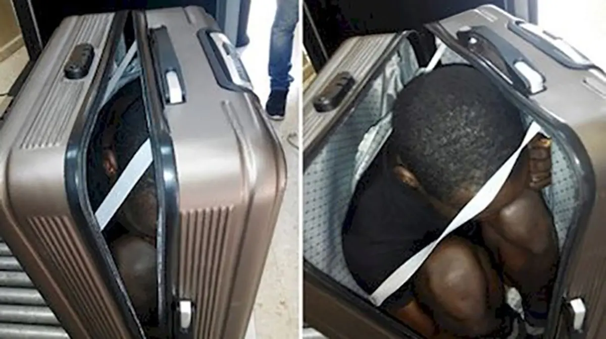 مهاجر 19 ساله که درون چمدان قاچاق Contraband شده است اهل " گابن " بوده و خود را به طور کامل جمع کرده تا درچمدان به خوبی جا شود .
