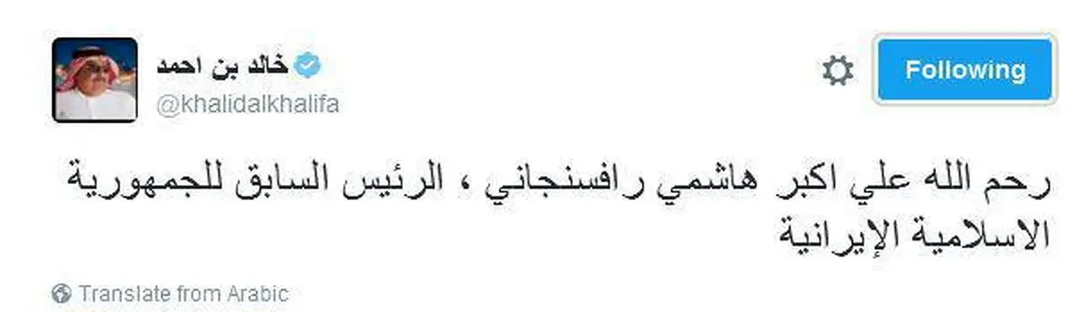 رکنا: تسلیت توئیریِ احمد بن خالد وزیر خارجه بحرین به مناسبت درگذشت آیت الله #هاشمی_رفسنجانی