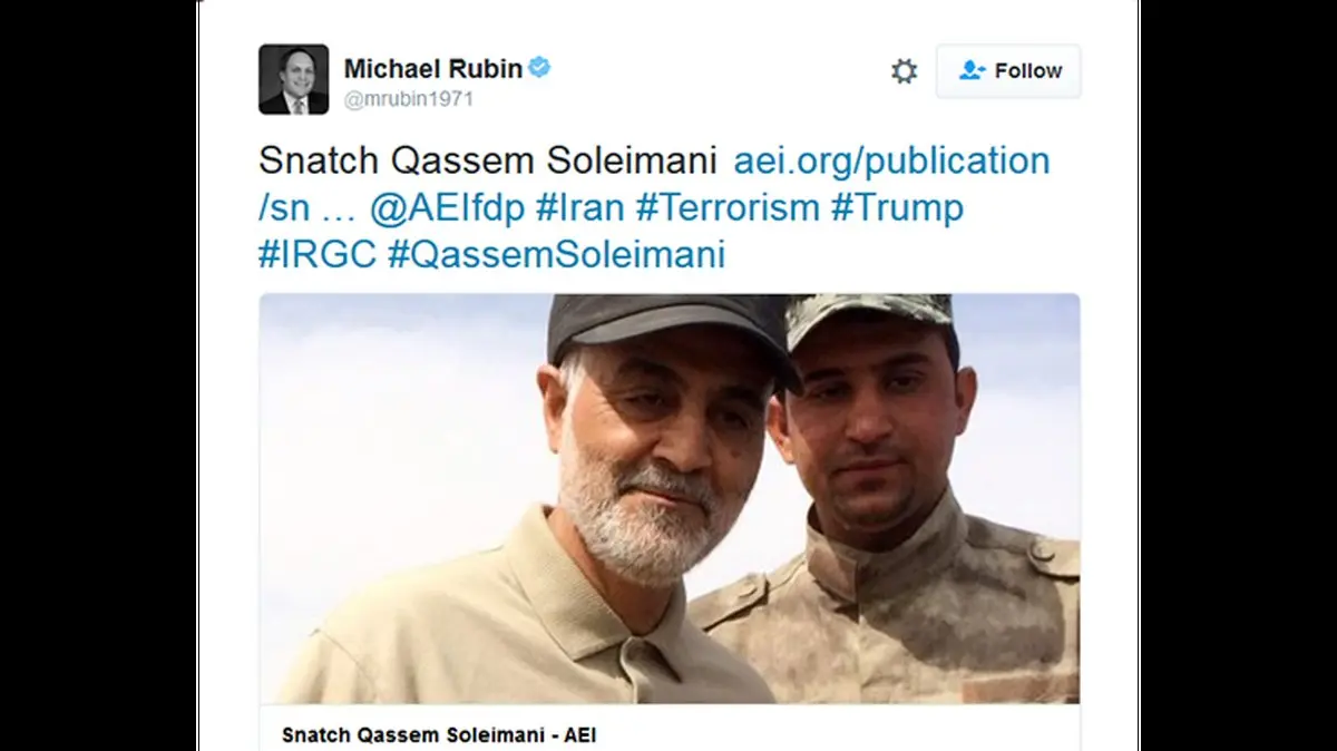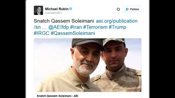 "مایکل روبین" کارشناس مسائل خاورمیانه در "مؤسسه آمریکن اینترپرایز" از دولت جدید آمریکا خواسته است تا سردار سلیمانی را بربایند.