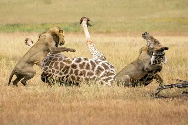 لحظات زمین گیر شدن زرافه توسط شکارچیان طبیعت، توسط لنز دوربین یک عکاس حیات وحش شکار شد. یکی از شیرها که به گردن زرافه آویزان شده بود توانست با همکاری شیر دیگر زرافه را نقش زمین کند. این عکس ها توسط "وینسنت گرافهورت"، عکاس حیات وحش گرفته شده است.برای ورود به کانال تلگرام ما کلیک کنید.