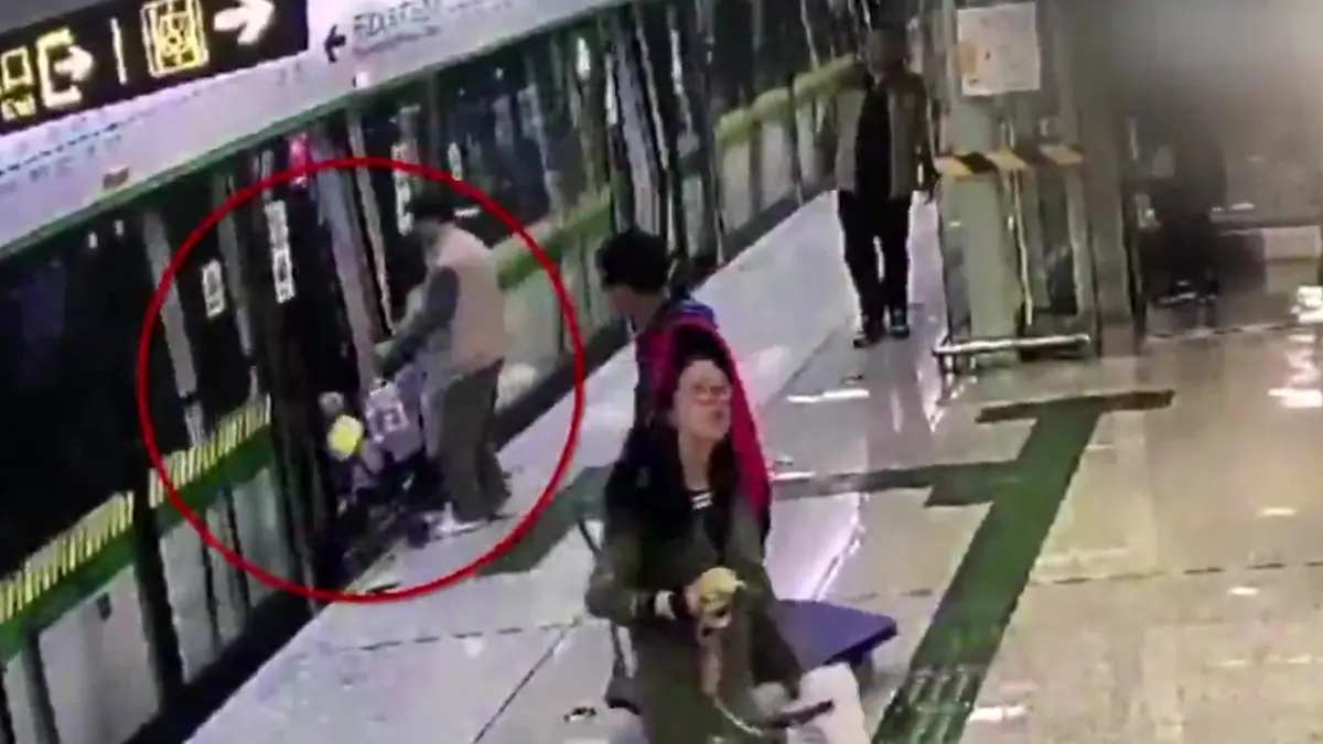 رکنا: پدر چینی سعی داشت با کالسکه فرزندش مانع بسته شدن در قطار شود و داخل واگن شود.