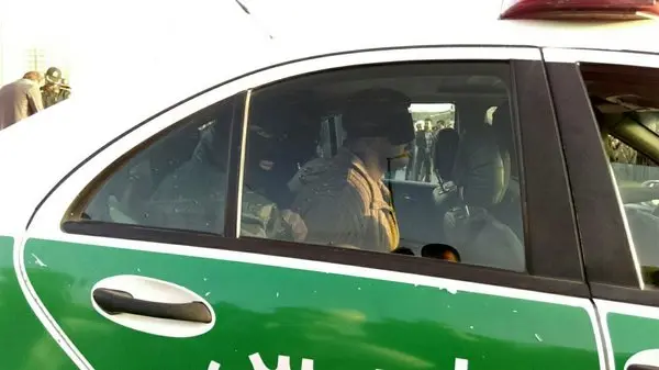 ابتدا سکوت همه جا را فرا گرفته بود تا اینکه در خودروی پلیس باز شد و متهم در حالیکه دستبند و پا بند داشت به کمک مامور بدرقه پلیس از خودرو خارج شد.