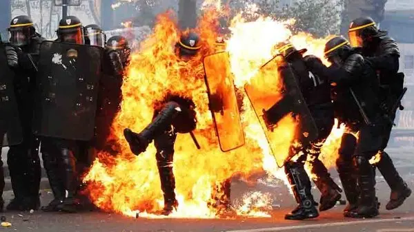رکنا: تظاهرکنندگان فرانسوی در روز کارگر با پلیس درگیر شدند و چند افسر را به آتش کشاندند.