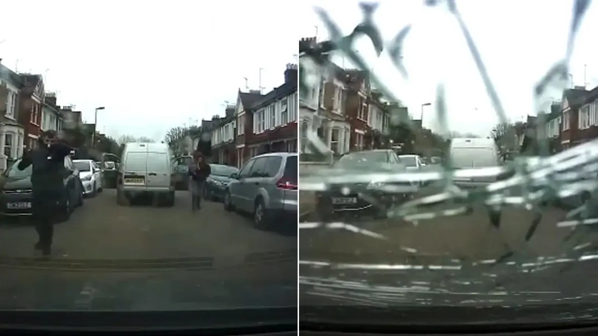 رکنا: سارقان چکش بدست انگلیسی پس از ربودن تجهیزات صوتی با چکش به سمت خودرو این مرد حمله کردند تا او را بترسانند.
