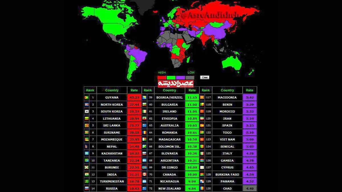 به گزارش گروه حوادث Accidents رکنا، بیشترین آمار خودکشی در جهان از میان 172 کشور جهان اعلام شد.