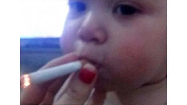 مادر این کودک در حالیکه می خندد سیگار خود را در مقابل دهان فرزندش قرار داده و به او اجازه می دهد تا سیگار بکشد.