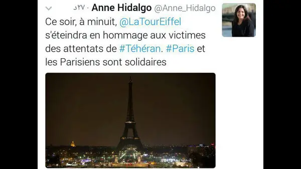 به گزارش گروه حوادث Accidents رکنا، آن هیدالگو شهردار پاریس اعلام کرد چراغ‌های برج ایفل امشب به احترام جانباختگان حوادث تروریستی تهران خاموش می شوند.
