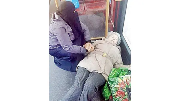 رکنا: زن مسلمانی که با روبنده در عکسهای منتشر شده در اینترنت مشخص است بیش از ۲۰ دقیقه در حال کمک به مسافر سالمندی بود که ناگهان روی کف اتوبوس افتاد.