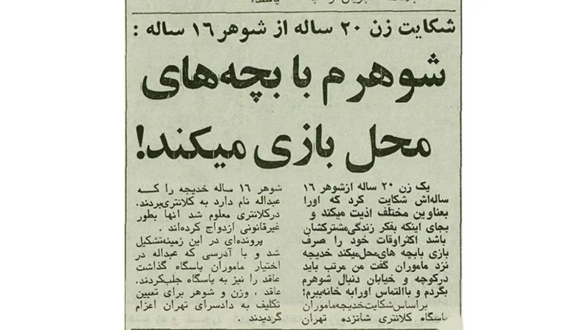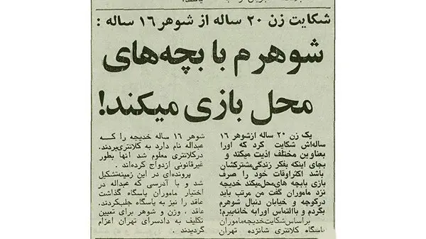 در سال 1355 پسری 16 ساله ازدواج کرد اما این ازدواج عاقبت خوبی برای او نداشت و ماجرای او و همسرش در روزنامه آن زمان بازخورد جالبی داشت. داستان این ازدواج را بخوانید.برای ورود به کانال تلگرام ما کلیک کنید.