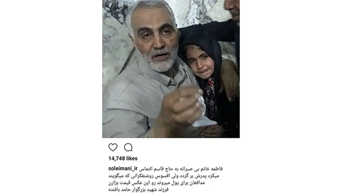 تصویر منتشر شده در صفحه اینستاگرام Instagram سردار سلیمانی مربوط به دختر شهید حامد بافنده است: "فاطمه خانم بی صبرانه به حاج قاسم التماس میکرد پدرش بر گردد ولی افسوس ...برای ورود به کانال تلگرام ما کلیک کنید.