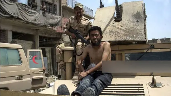 رکنا: نیروهای نظامی عراقی برای کسب اطلاعات بیشتر درباره یکی از اسرای داعشی ، او را در خیابانهای شهر موصل میگردانند تا اگر کسی از شهروندان اطلاعاتی درباره او دارد اعلام کند.