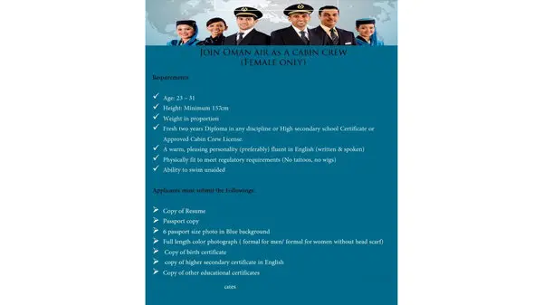 در آگهی این هواپیمایی با اشاره به اینکه این ایرلاین به دخترانی بین 23 تا 31 سال نیازمند است، شرایط دیگر ورود به پروسه استخدام را داشتن حداقل قد 157 سانتیمتر، مدرک تحصیلی مناسب، برخورد خوب، اطلاع از زبان انگلیسی در حد نوشتن و خواندن و نداشتن خالکوبی و کلاه گیس دانسته است.