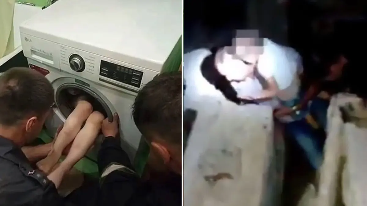 یکی از پسران درون ماشین لباسشویی به دام افتاده و دیگری در بین بتنی های سیمانی گرفتار شده است.