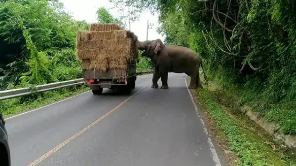 یک فیل در اتوبانی در تایلند یک کامیون را متوقف کرد و مقداری از بار این خودرو برداشت. این ویدئو که توسط یکی از رانندگان ضبط شده است صحنه نزدیک شدن فیل غول پیکر را به یک کامیون نشان می دهد. این فیل که به مشخص نیست از چه طریقی وارد جاده شده است به ماشین حمل بار نزدیک می شود و مقداری یونجه از آن بر می دارد. ابرای ورود به کانال تلگرام ما کلیک کنید.