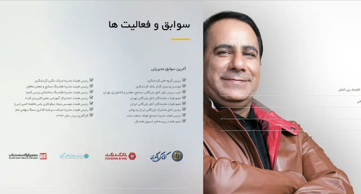 او همچنین رئیس هیات مدیره مجتمع فولاد صنعت بناب، عضو هیات رئیسه فدراسیون هندبال، رئیس هیات مدیره شرکت نگین گردشگری، رئیس هیات مدیره شرکت هدلینگ صنایع و معادن ماهان و... است و سوابق همکاری طولانی با طیف مشایی در دولت احمدی نژاد و همچنین با دولت کنونی داشته است.